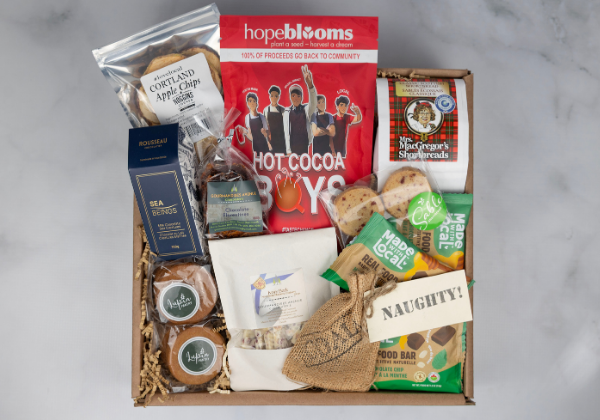 A curated assortment of Nova Scotia’s finest sweet treats, perfect for sharing with family and friends this holiday season. From decadent chocolates and crisp shortbreads to festive gingersnaps and indulgent hot chocolate, this curated box brings warmth, joy, and local flavour to every celebration.