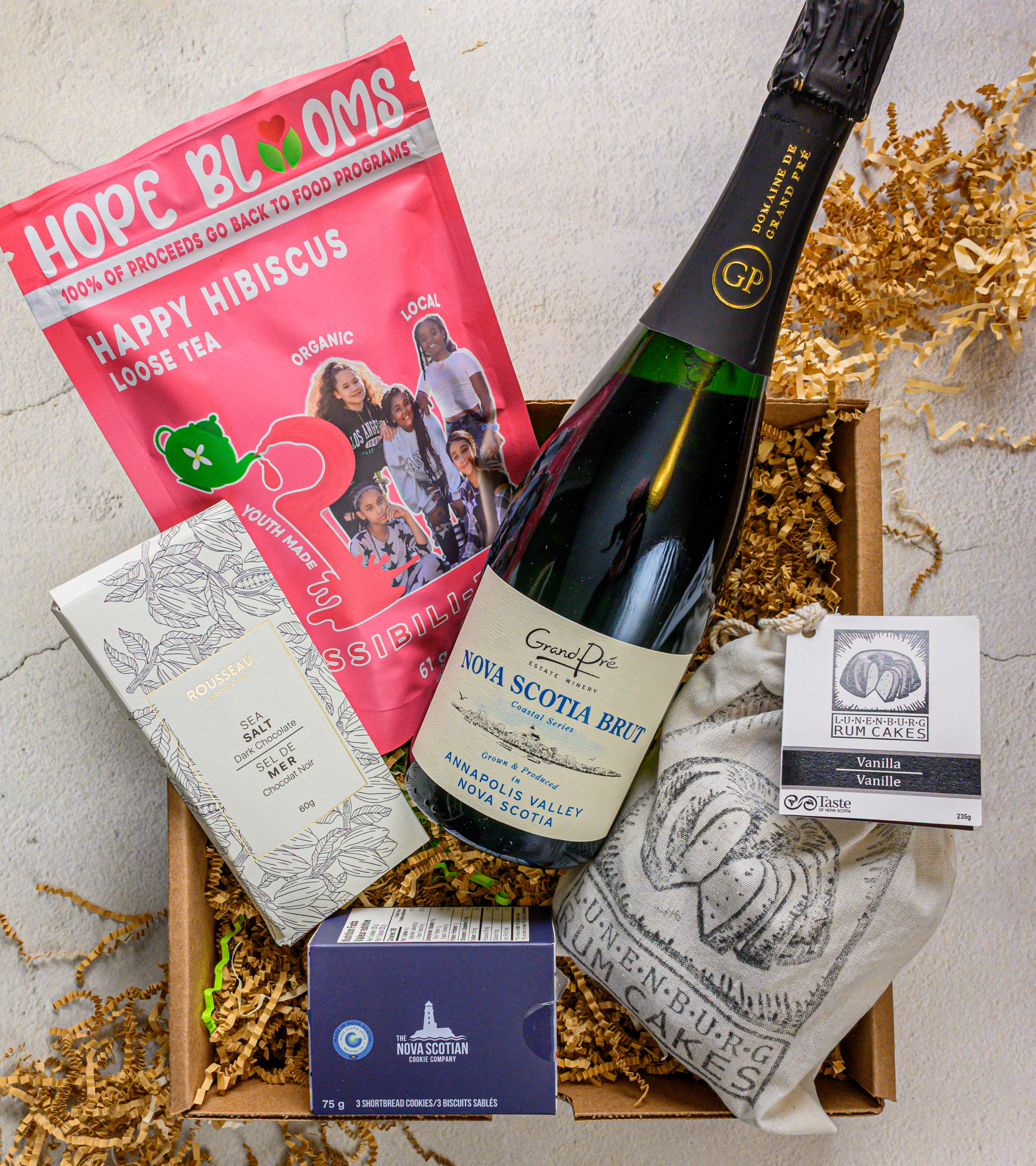*Products subject to change based on availability. We have a variety of Nova Scotia sparkling wines in stock. The wine you receive may not be the wine pictured. If you have a specific request for sparkling wine, please leave this in the notes section of your order, or contact us at giftbaskets@tasteofnovascotia.com.